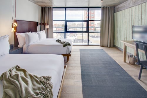 Contemporary hotel with floor to ceiling windows and iconic views of the New York City skyline in Long Island City.