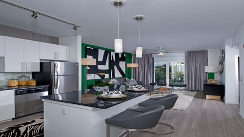 Looking for a sweet spot in Downtown Orlando? Camden Thornton Park has it all in the thriving Thornton Park/South Eola neighborhood, surrounded by the Arts District. Whatever your vibe, we have an array of one, two, and three-bedroom, open-concept floor plans perfect for you. You’ll love entering your beautiful apartment home with airy 9-foot ceilings bathed in natural light from large windows, modern wood-inspired flooring, and the convenience of a full-size washer and dryer. Whether you use your kitchen for gourmet meals or displaying your favorite take-out, each is complete with granite countertops, stainless steel appliances, and a kitchen island with extra storage. If available, choose from white or mocha finishings in the kitchen and bathrooms. The Edgewater and Gulf floor plans feature a unique area just off the kitchen where you could add a small desk to create a home office space. The three-bedroom Hollywood floor plan features great views of the city from the floor-to-ceiling windows. Life inside your home at Camden Thornton Park also includes walk-in closets, soaking bathtubs, and a private balcony. Amenities include a 24-hour concierge, 24-hour gym, and more! We're also home to SNAP! an art gallery featuring local artists' work. Do you own a small business and would love some retail space? Camden Thornton Park has awesome street-level live/work apartments that will give your small business visibility on Church Street. We can’t wait to welcome you home! Camden residents can take advantage of an exclusive discount with CORT to rent furniture and accessories for your apartment home. Schedule an appointment and see for yourself. We partner with Vero, a third-party screening company, to verify the identity and income of all applicants. Pricing and availability are subject to change until a quote is saved. Call or visit camdenliving.com to save a quote. Bonus! No deposit is required with approved credit! Some restrictions may apply.