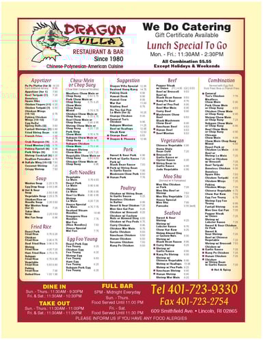 Dragon Villa Restaurant & Bar has been serving Chinese-Polynesian-American Cuisine since 1980. Our menu can be enjoyed with dine in or carry out. We offer lunch specials to go as well. Enjoy our full bar every day. Call or stop in today! We hope to see you soon!